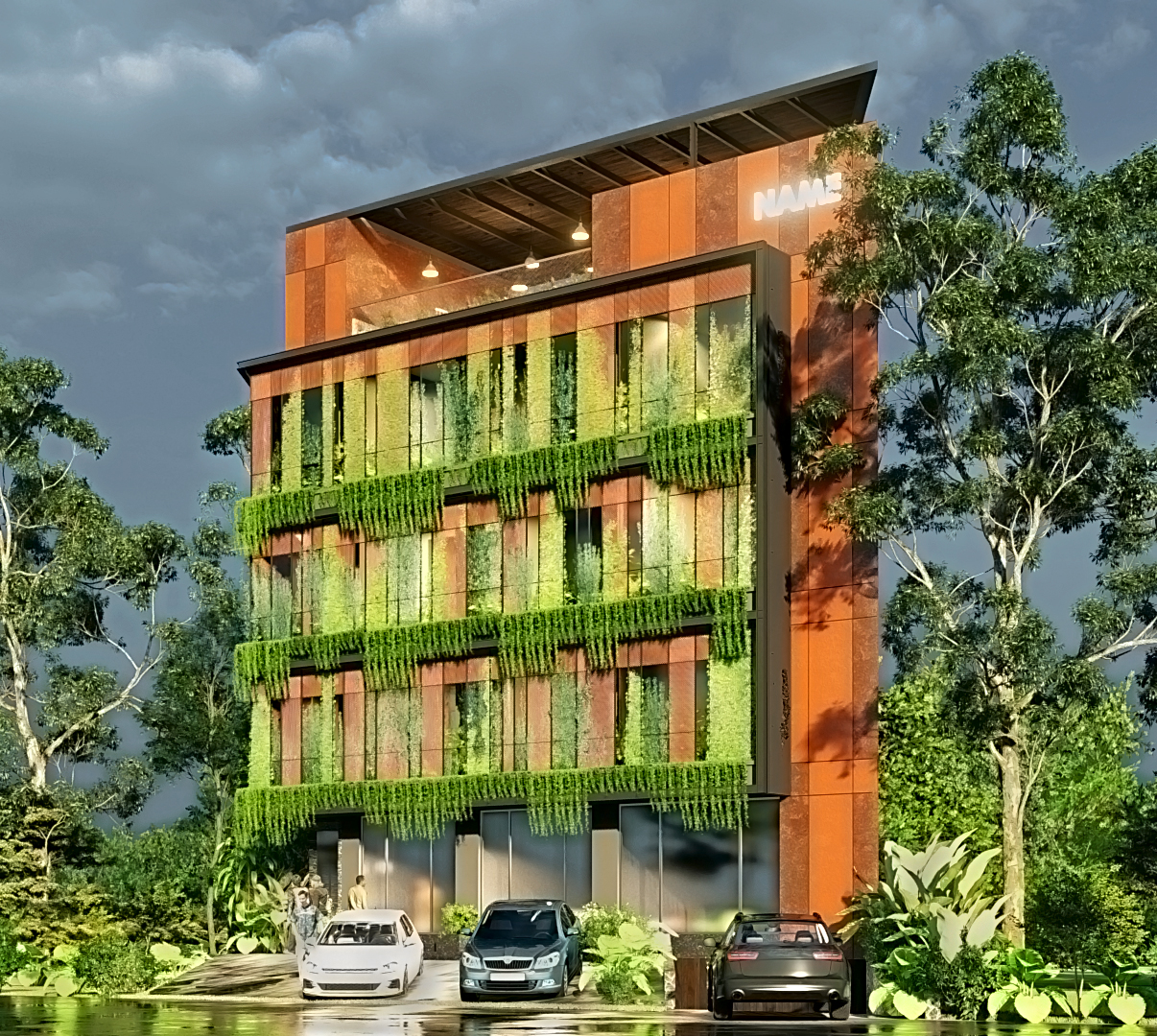 The facade design creates a simple pattern which is repeated all around. Porous metal screens allow greenery to grow and cover the facade. Monastery of Architecture
