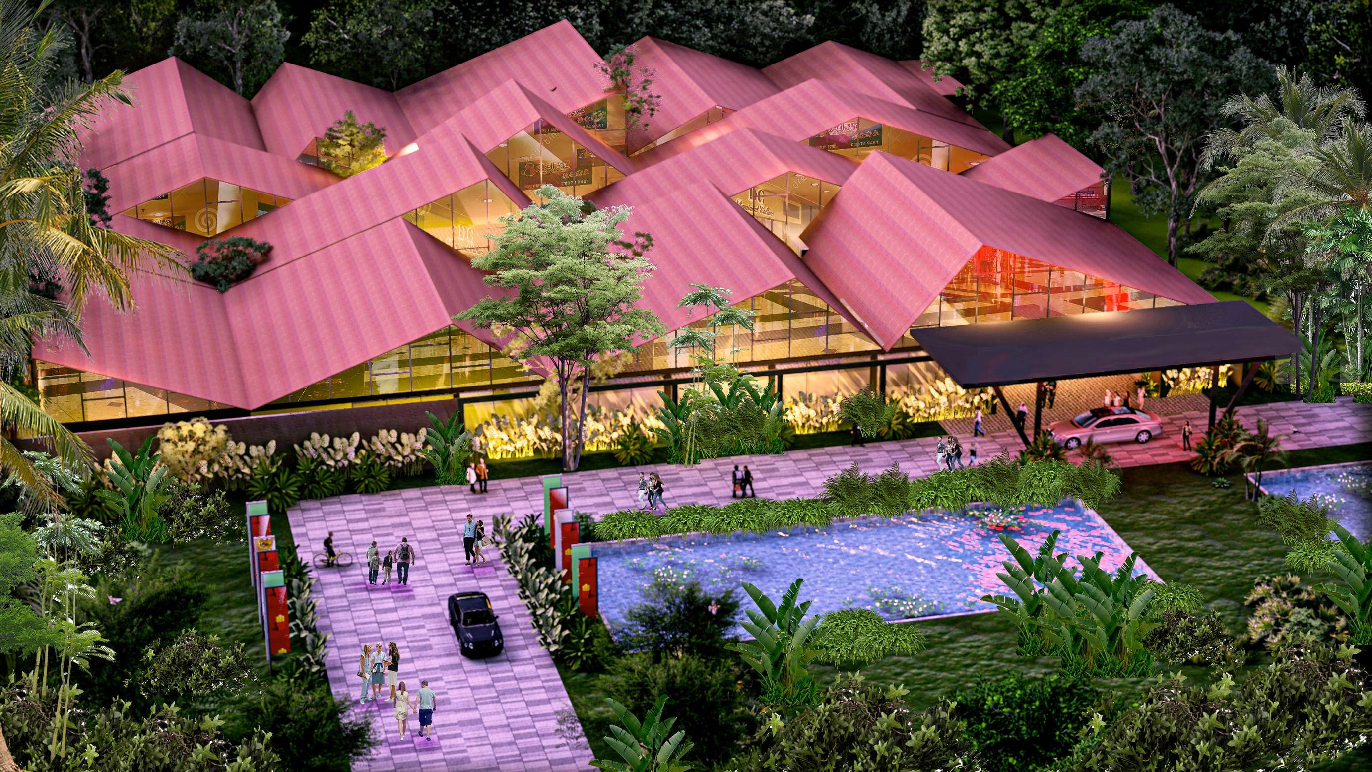 Meant to serve as a place to pause and relax for people travelling long distances, the design creates a street like space inside with shops, eateries and entertainment activities on either side creating a dynamic street shopping experience, while being protected from the elements. The design takes inspiration from the surrounding mountain ranges of Wayanad. The roof form references the mountain ranges, creating an interesting and dynamic space inside. Instead of creating a single monolithic roof, the roof is divided into segments, creating a simpler, efficient structure, as well as allowing light to spill out from the skylights on the longitudinal sides. At night, this would be visible from multiple points of the ghat road, creating a strong visual identity for the project. #commercial project #mall #indoor mall #street shopping #retail space design Monastery of Architecture